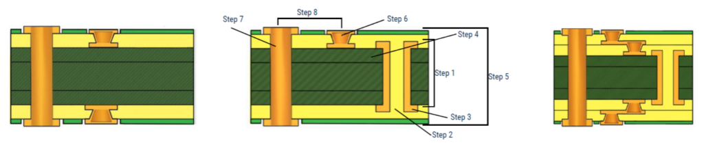 The 1-N-1 stack adds one sequential lamination either side of the core adding two further copper layers to the top and bottom as illustrated below. The central buried via is mechanically drilled and gets naturally filled with the dielectric material, while the smaller micro-vias are laser drilled. For the same number of overall layers, 1-N-1 has shorter via stubs and smaller aspect ratios than the 0-N-0 standard lamination.