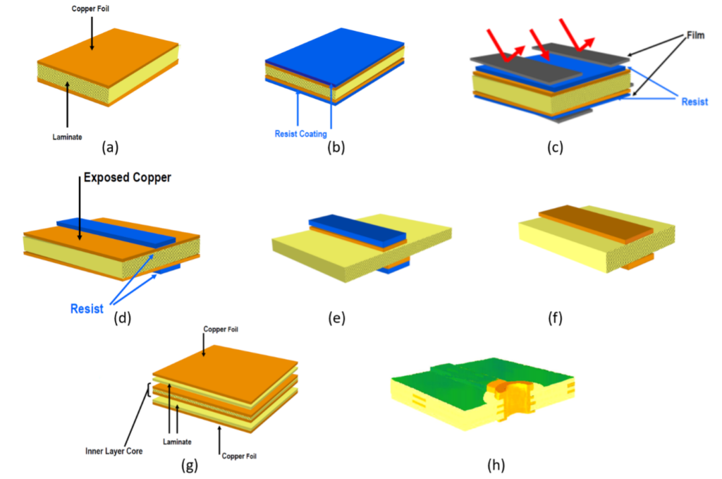 Figure 4 : (a) inner core (b) addition of photoresist (c) addition of artwork film and exposure to UV radiation (d) chemical developer removes resist from areas not polymerised by light (e) etch away copper not covered by resist (f) removal of resist (g) sequential lamination of outer layers (h) addition of soldermask.