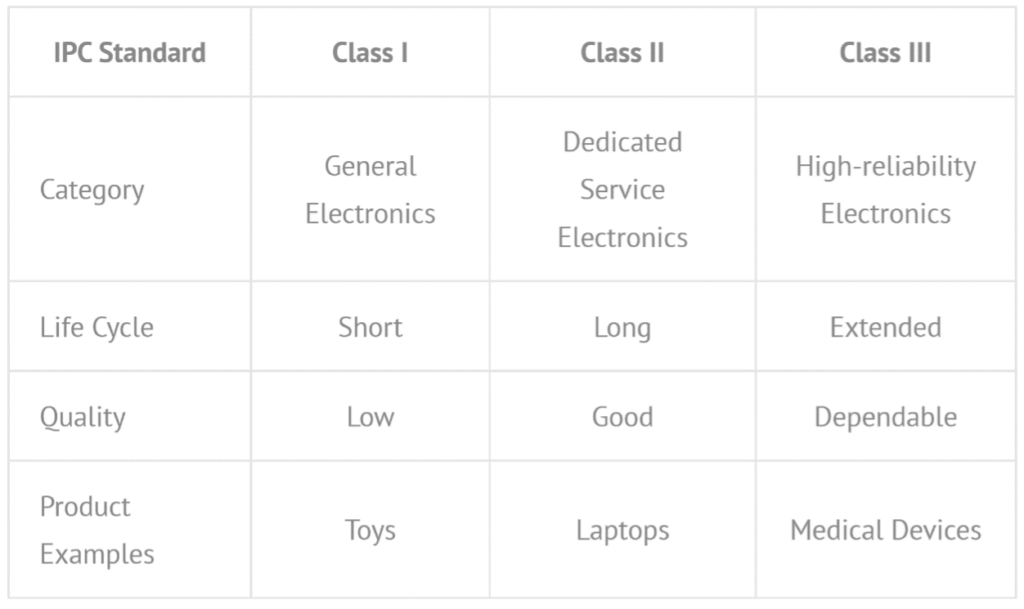 Most reputable fabricators manufacture bare-boards to IPC quality and reliability standards such as IPC-A-600J, IPC-601x, IPC-6012D and IPC-222x. The latter establishes generic guidelines for PCB design, component mounting and interconnections, with specific rules for rigid (2222), flex (2223), MCM-L (2225) and HDI (2226) boards. The IPC defines four quality classes which differ in the level of inspection based on the reliability and criticality of the final application, as well as the operating environment.